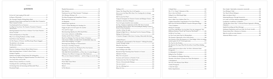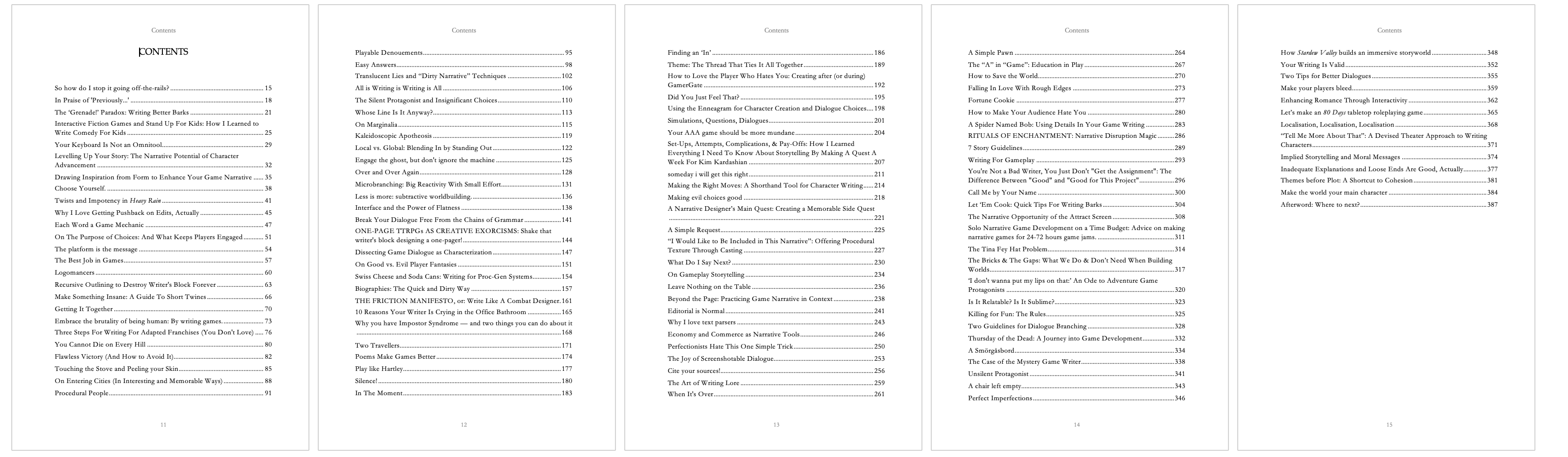 There are articles on every topic: branching narrative and linear storytelling; worldbuilding and mystery; dialogue writing and silence; surviving in large studios and how to start small.